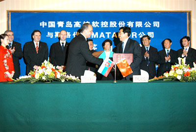 2004年5月11日,我公司與斯洛伐克瑪達(dá)道爾(MATADOR)公司在青島海天大酒店舉行“輪胎設(shè)備技術(shù)合作簽約儀式”。斯洛伐克副總理帕沃爾 羅斯克(Pavol Rusko)先生、青島市人大常委會(huì)副主任馬論業(yè)、青島市委副書記、常務(wù)副市長(zhǎng)崔錫柱、中國(guó)橡膠工業(yè)協(xié)會(huì)理事長(zhǎng)鞠洪振等有關(guān)領(lǐng)導(dǎo)出席了簽約儀式。