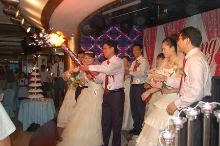 下午17時08分,婚宴典禮儀式在銀海大世界正式開始。公司副總裁張澤恩為新人證婚,并代表公司向新人及其親屬表示真誠的祝愿。婚宴現(xiàn)場親情融融,熱鬧非凡。音樂聲中,副總裁王金健手持火炬,將幸福的火種依次傳遞給五對新人,最后,承載著幸福夢想的心形燭火被點燃,一時間全場沸騰,熱鬧的氣氛達到高潮。宴會上,來賓們還欣賞到了精彩紛呈的文藝表演。