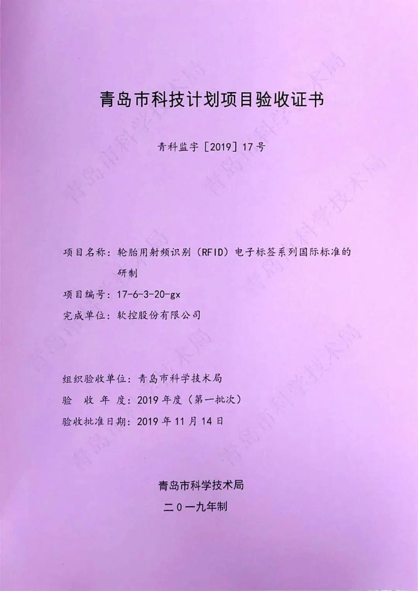 近日,軟控承擔(dān)的2017年青島市民生科技計(jì)劃項(xiàng)目“輪胎用射頻識(shí)別(RFID)電子標(biāo)簽系列國際標(biāo)準(zhǔn)的研制”順利完成全部驗(yàn)收工作,青島市科學(xué)技術(shù)局下發(fā)青島市科技計(jì)劃項(xiàng)目驗(yàn)收證書。